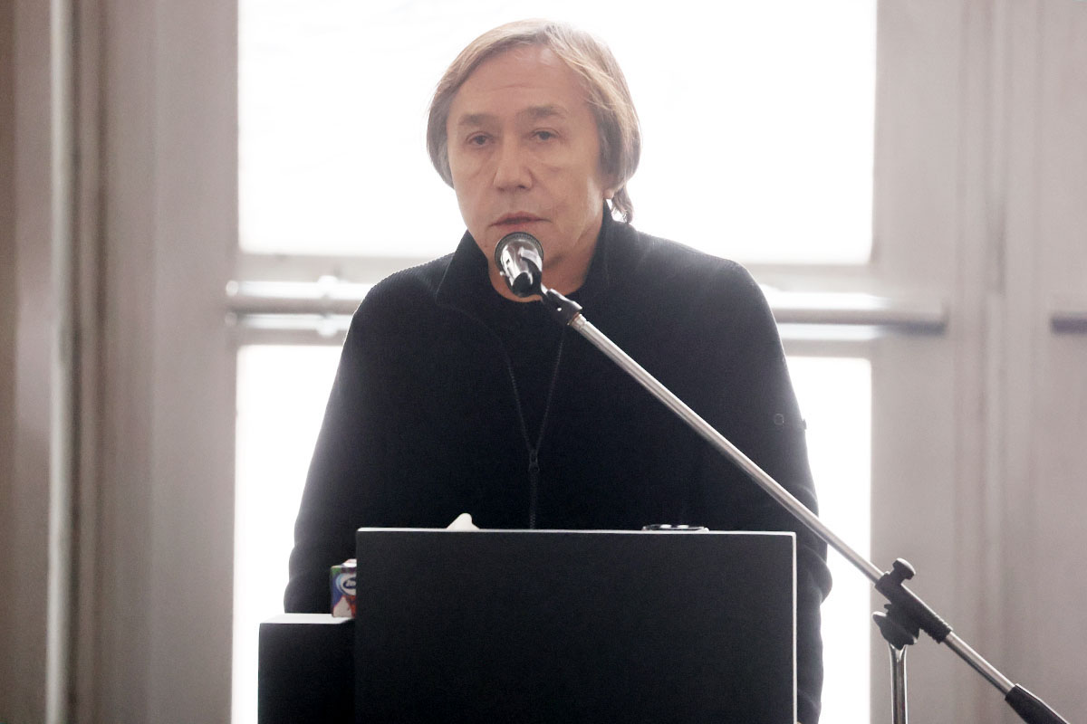 Художник Никас Сафронов на церемонии прощания с членом Академии Российского телевидения Александром Олейниковым в траурном зале Троекуровского кладбища