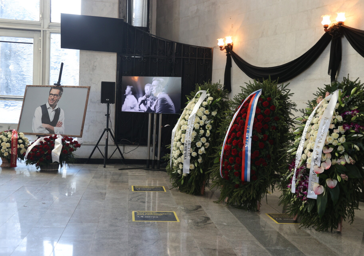Церемония прощания с телеведущим Михаилом Зеленским, который скончался 11 января на 47-м году жизни, в прощальном зале похоронного дома Троекурово в Москве