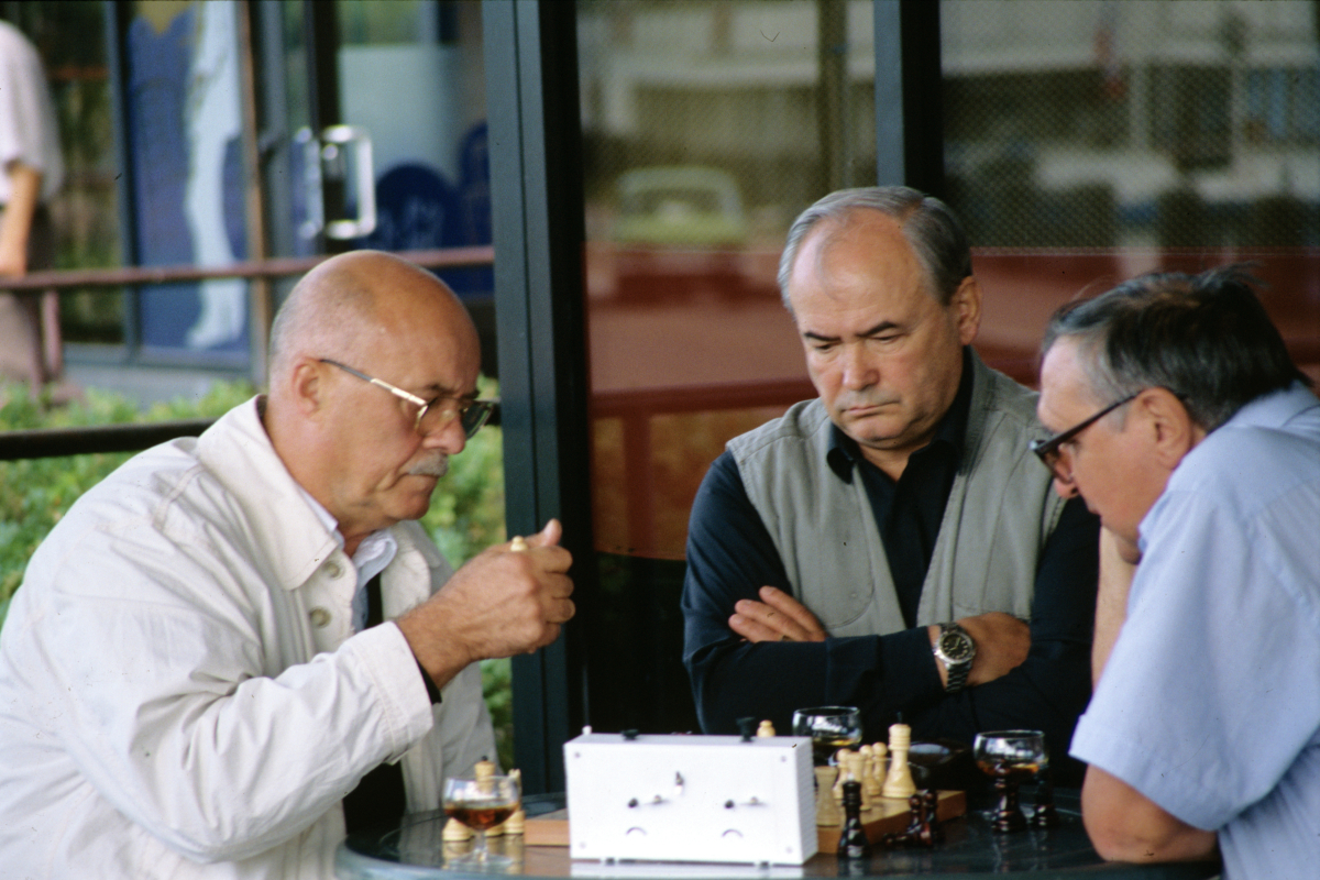 7-й Всероссийский кинофестиваль «Окно в Европу». 9-15 августа 1999 г. Артисты играют в шахматы (слева направо): режиссер Станислав Сергеевич Говорухин, актер и режиссер Всеволод Николаевич Шиловский, композитор Владимир Сергеевич Дашкевич