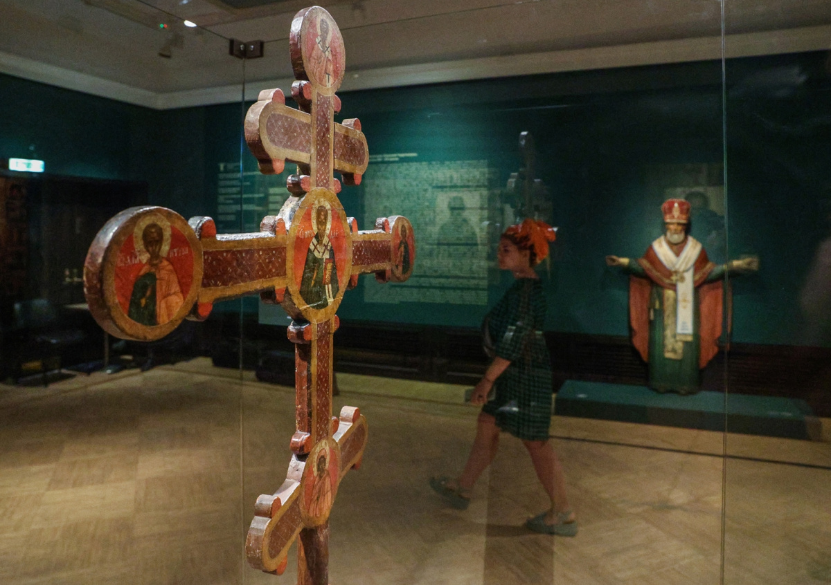 Крест запрестольный (начало XVI века. Новгород) на выставке «Святитель Николай Чудотворец. Иконы XIII-XX веков» в Инженерном корпусе Третьяковской галереи