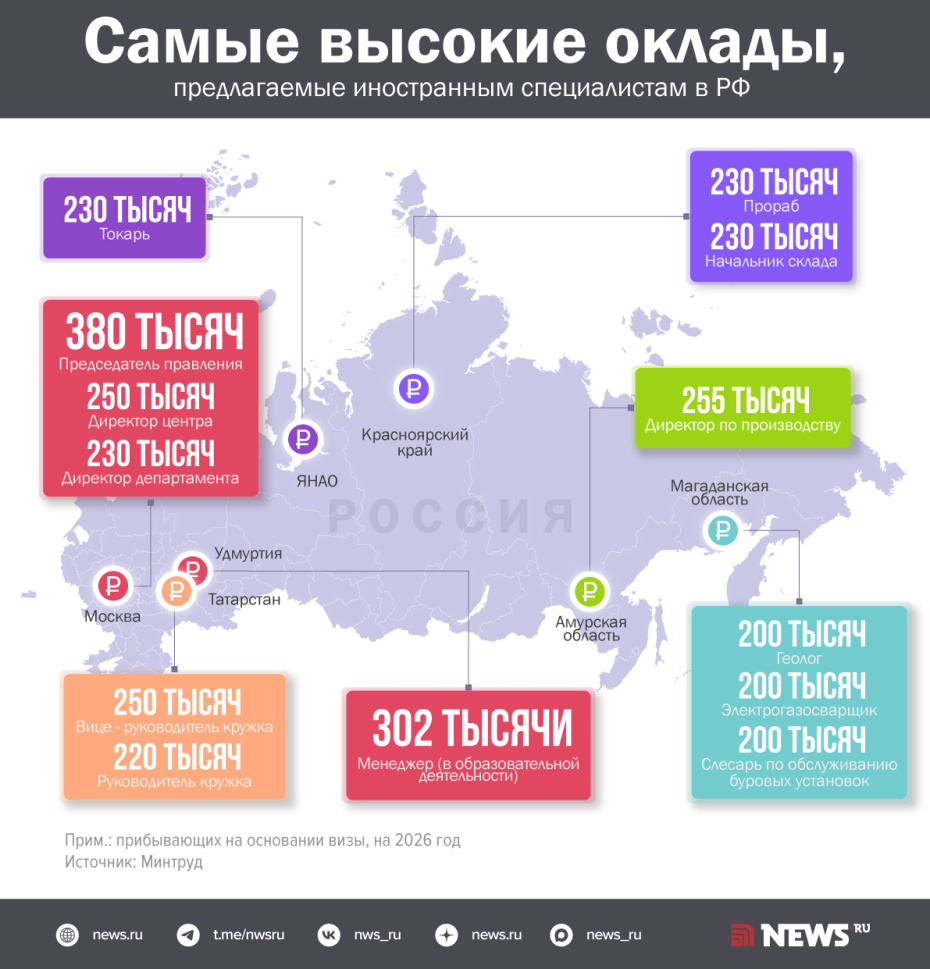 Согласно данным Минтруда (по иностранным работникам, прибывающим на основании визы, на 2026 год), самые высокие зарплаты предлагаются топ-менеджерам и узким специалистам. Лидером по доходу стал председатель правления одной из компаний в Москве — 380 тыс. рублей в месяц. Чуть меньше — 302,9 тыс. рублей — обещают менеджеру по образовательной деятельности в Удмуртии. Замыкает тройку директор по производству в Амурской области с окладом 255 тыс. рублей.