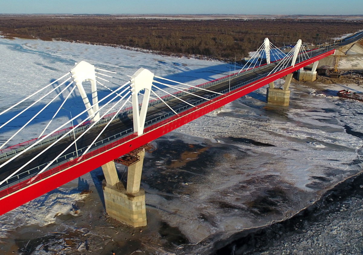 Амурский мост строился синхронно с двух сторон. После окончательного ввода его в эксплуатацию весной 2020 года движение сначала будет открыто для грузового транспорта, для легкового — только через полтора года. Общая протяжённость мостового перехода составляет 20 км (6 км — дороги в Китае и 13 км — подъездные пути на территории России, в которых ещё 278 метров — мост через протоку Каникурганскую). На российской стороне мост начинается на острове, и к нему ведёт Каникурганское сооружение.