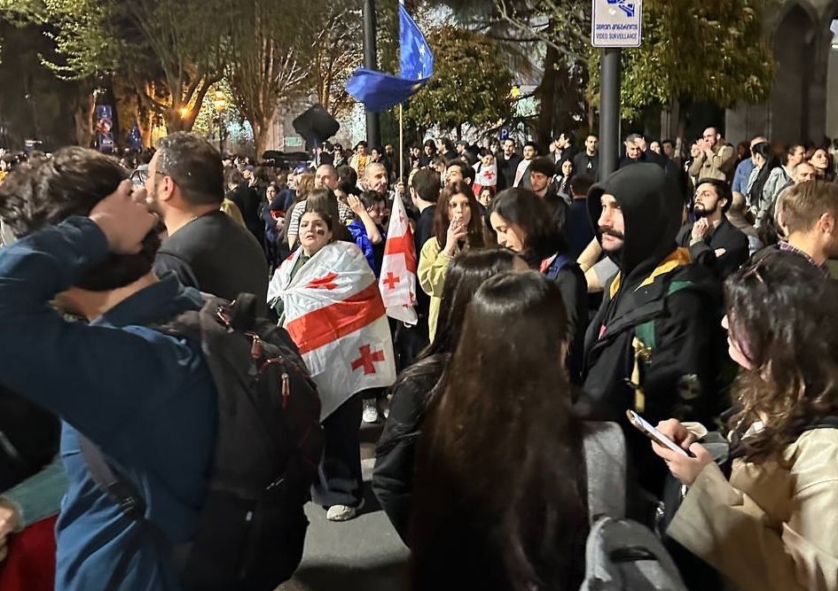 Вокруг здания парламента дежурят усиленные наряды полиции. Правоохранители вооружены щитами и водометами. Проспект Руставели в Тбилиси полностью перекрыли. Пока ситуация на митинге спокойная. Участники протеста решили с поднятыми руками обойти парламент по кругу.