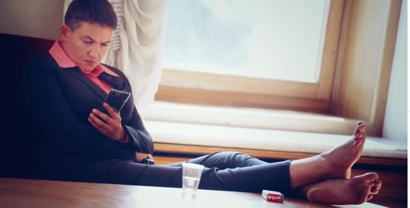 Фотограф Ян Доброносов опубликовал в социальной сети фото бывшего депутата Верховной рады Надежды Савченко. На снимке видно, что она закинула ноги на стол, а рядом находятся пачка сигарет и одноразовый стаканчик.