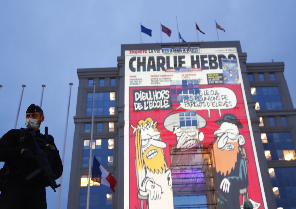 Карикатуры на пророка Мухаммеда, публиковавшиеся в журнале Charlie Ebdo, из-за которых, по мнению французской полиции, произошло убийство учителя Самюэля Пати, спроецировали на стену ратуши в городе Монпелье.