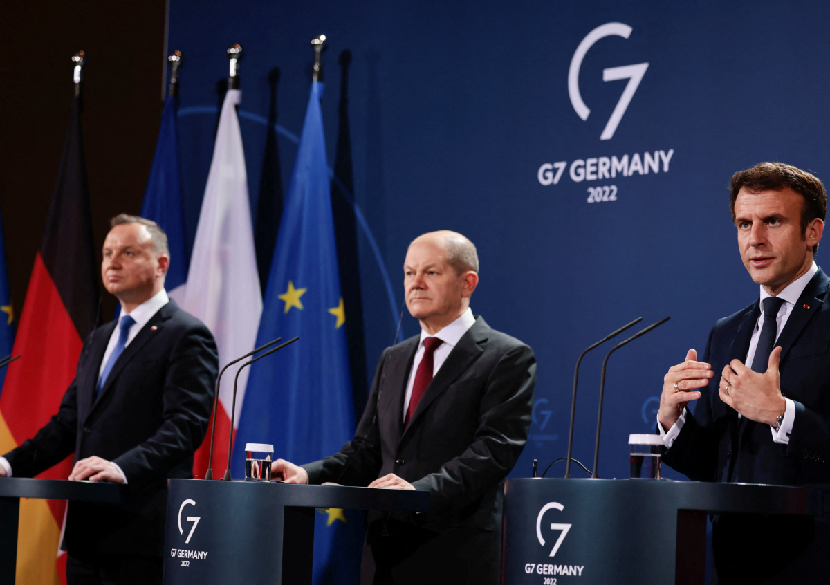президент Польши Анджей Дуда, канцлер Германии Олаф Шольц (СДПГ) и президент Франции Эммануэль Макрон президент Польши Анджей Дуда, канцлер Германии Олаф Шольц (СДПГ) и президент Франции Эммануэль Макрон Фото: Hannibal Hanschke/dpa/Global Look Press