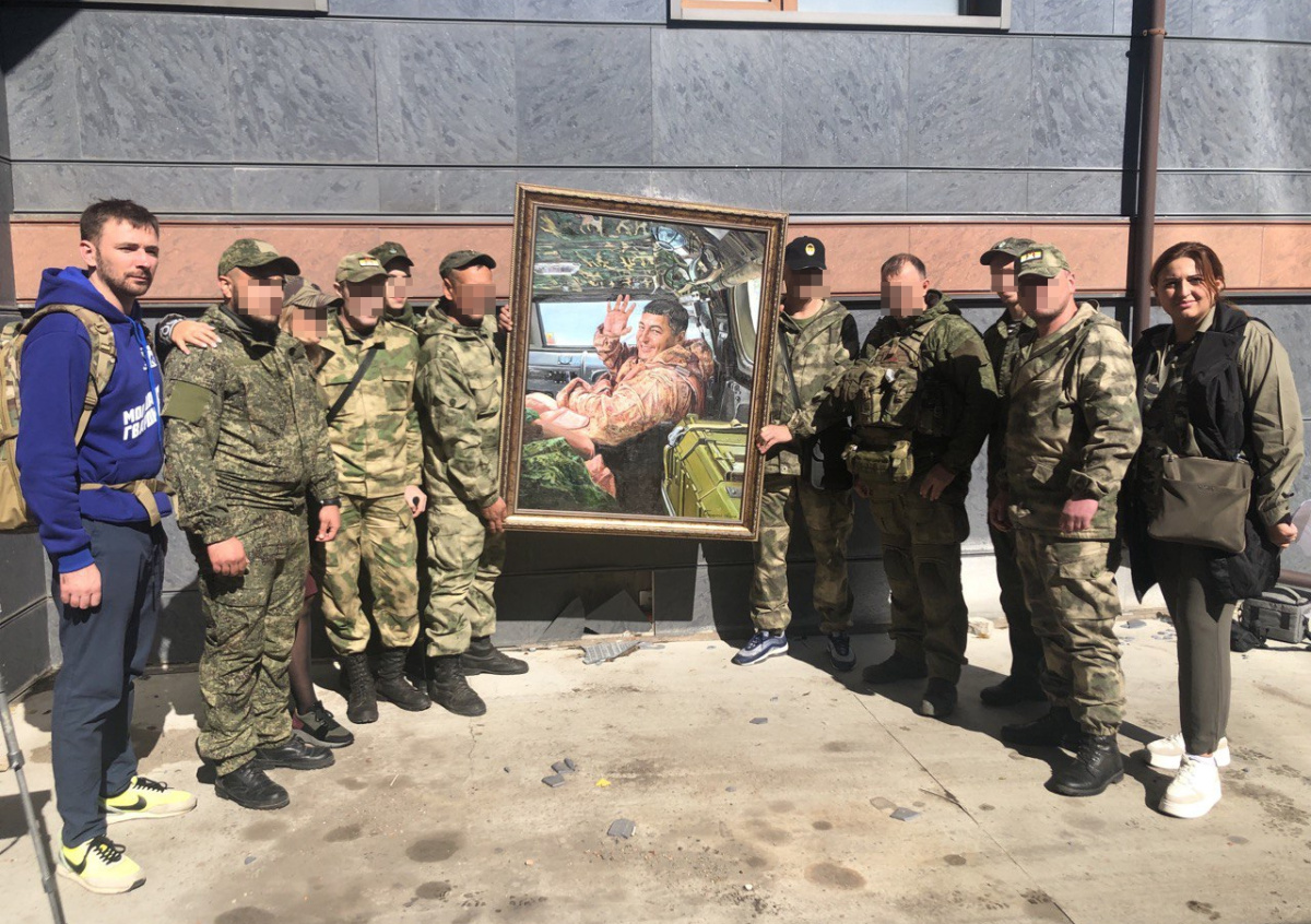 Бойцы «Спарты» с портретом погибшего генерала Романа Кутузова (позывной Туман)