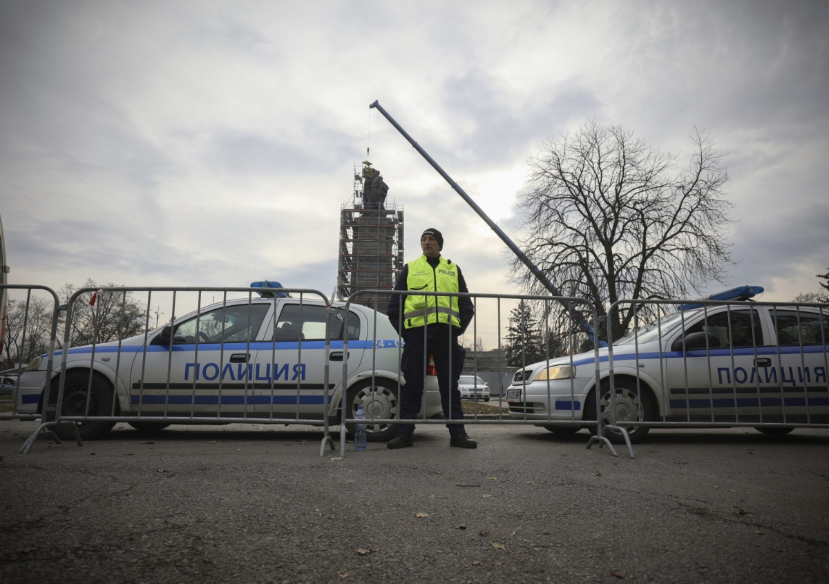 Болгария. София. Полицейский во время демонтажа памятника Советской армии Болгария. София. Полицейский во время демонтажа памятника Советской армии Фото: Valentina Petrova/AP/TASS