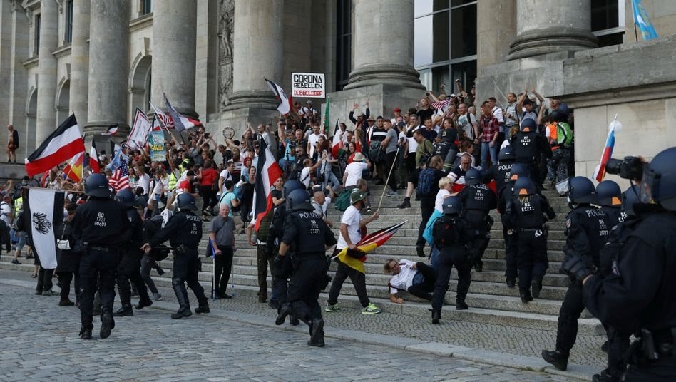 Президент ФРГ Франк-Вальтер Штайнмайер жёстко раскритиковал радикально настроенных протестующих, которые вечером 29 августа 2020 года после митинга забрались на ступени здания Рейхстага. По его словам, действия граждан являются «ударом в сердце» демократии Германии.