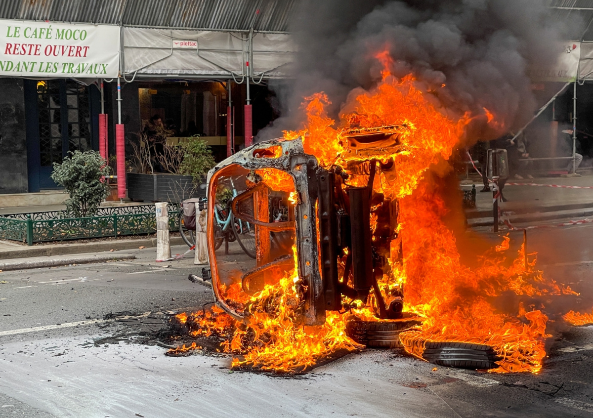 Париж. Автомобиль, подожженный участниками акции протеста против пенсионной реформы Париж. Автомобиль, подожженный участниками акции протеста против пенсионной реформы Фото: Арина Лебедева/ТАСС