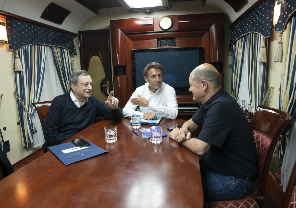 Премьер-министр Италии Марио Драги, президент Франции Эммануэль Макрон и федеральный канцлер Германии Олаф Шольц прибыли на Украину, сообщает итальянский новостной телеканал RaiNews24. На экране показали фотографию трех европейских лидеров, которые проводили неформальную беседу в поезде. Для каждого из них это будет первый визит на Украину с начала военной операции.