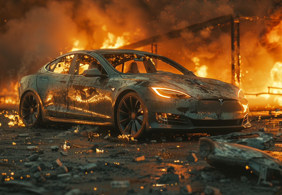Сразу семь Tesla вспыхнули на парковке перед автосалоном