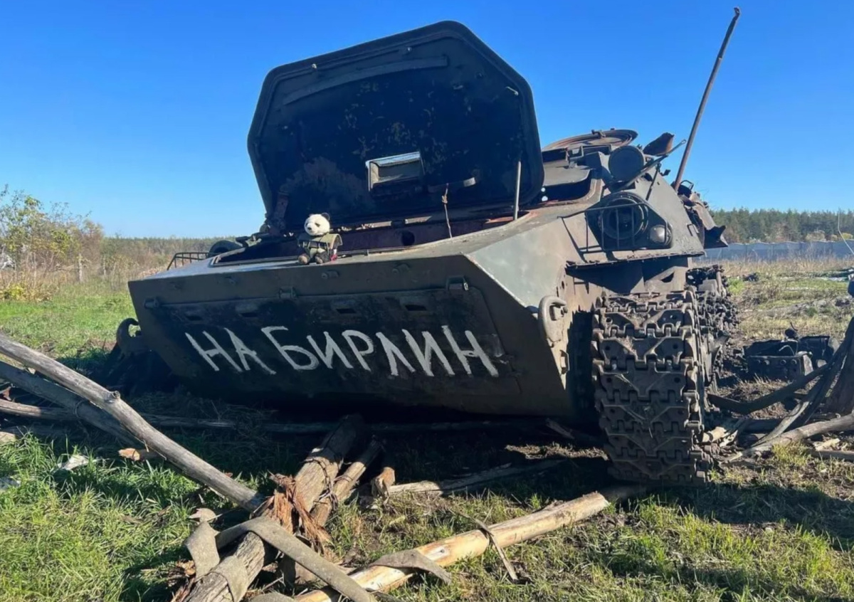 Как пишет российское агентство, УНИАН опубликовало кадры, на которых показана якобы подбитая гусеничная машина, на лобовой броне которой также была надпись «На Берлин», сделанная с ошибками. Позднее украинское информагентство пояснило, что это декорация, заготовленная для фильма, который в настоящее время снимается в Харьковской области. Свое заявление они подтвердили, опубликовав видео со съемок картины — на кадрах видна работа съемочной группы.