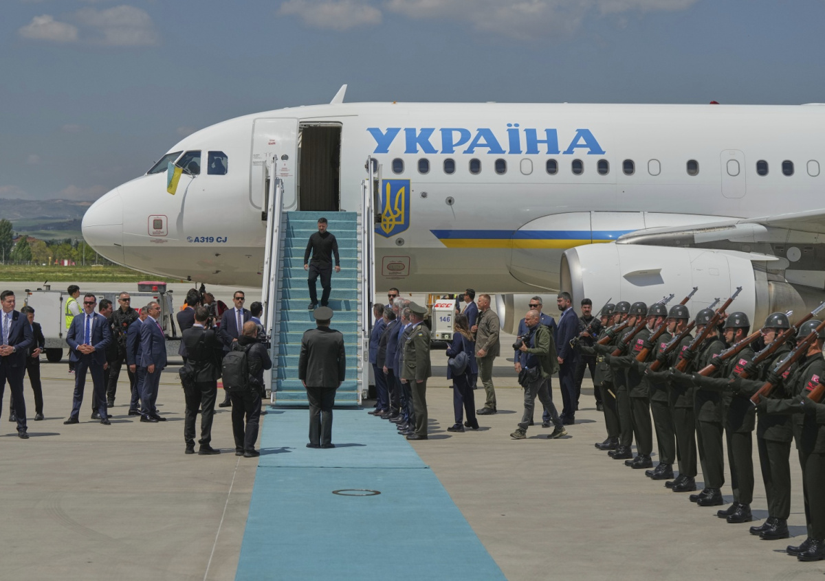Самолет Зеленского приземлился в Анкаре около 12:20 по московскому времени. Его встречали украинские и турецкие чиновники, в том числе глава Министерства иностранных дел Украины Андрей Сибига.