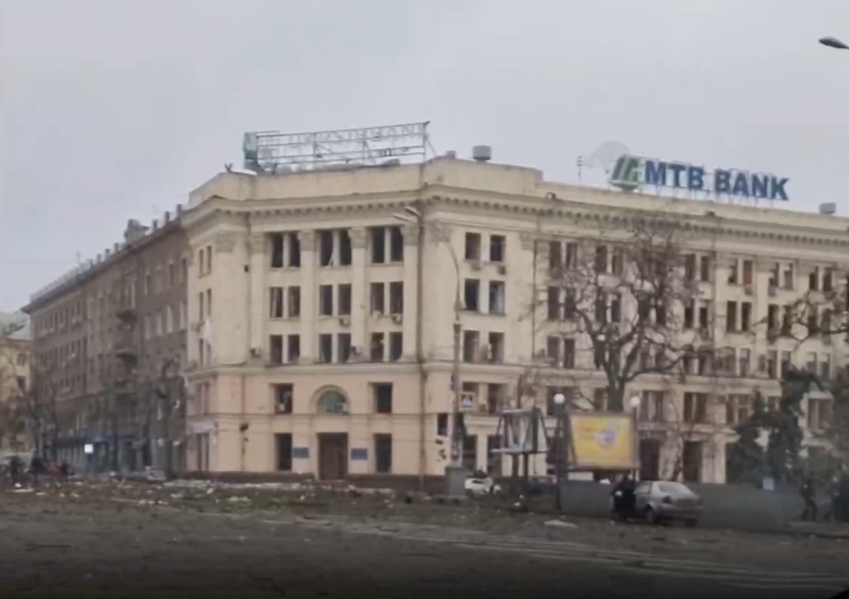 Ряд Telegram-каналов опубликовал кадры удара по центру Харькова, снятые вблизи здания администрации Харьковской области. На них виден мощный взрыв снаряда. Очевидцы также выкладывают кадры последствий обстрелов.