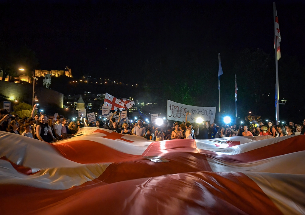 Грузия. Тбилиси. Участники акции против законопроекта об иноагентах у здания парламента Грузии