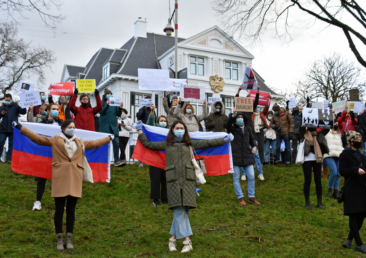 Нидерланды. Гаага. Участники акции солидарности в поддержку оппозиционера Алексея Навального у здания посольства России Нидерланды. Гаага. Участники акции солидарности в поддержку оппозиционера Алексея Навального у здания посольства России Фото: Полина Наседкина/ТАСС