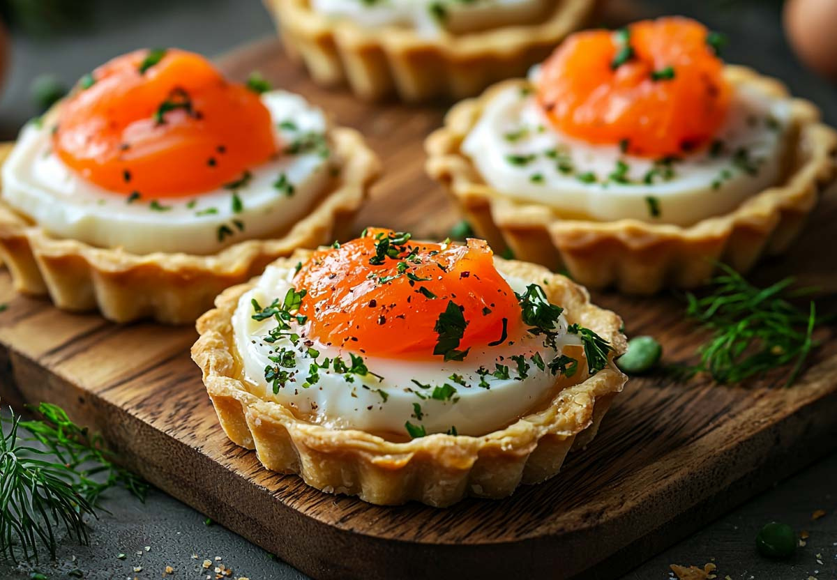 Для 10–12 тарталеток понадобится: 150 г слабосоленой красной рыбы, 2 вареных яйца, 2 ст. ложки сливочного сыра (вроде «Филадельфии»), 1 ч. ложка сока лимона, немного укропа и щепотка черного перца. Рыбу мелко нарежьте, яйца натрите на мелкой терке, добавьте сливочный сыр, лимонный сок и зелень. Перемешайте до нежной, почти воздушной консистенции.