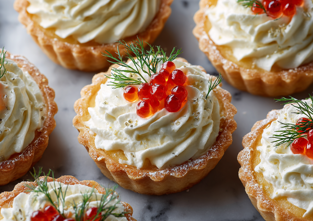 Тарталетки «Новогодний снежок» полностью оправдывают свое название: нежная, воздушная начинка выглядит празднично и аппетитно, а творожный сыр делает ее вкус невероятно мягким. Эта закуска готовится за 15 минут и мгновенно исчезает со стола.