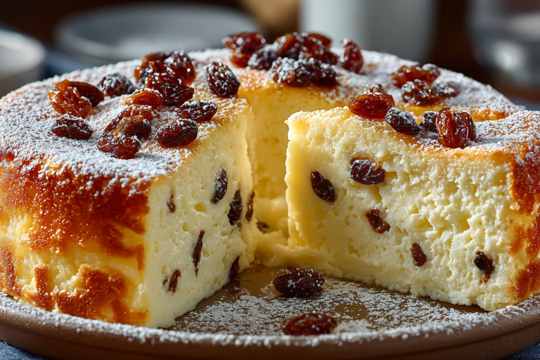 Разогрейте духовку до 180 градусов. В миске смешайте 600 г творога (лучше 5–9%), три яйца, 100 г сахара, пакетик ванильного сахара и щепотку соли. Взбейте блендером до однородной кремовой массы — никаких комочков. Добавьте 2 столовые ложки крахмала (кукурузного или картофельного) и 100 г изюма, предварительно замоченного в кипятке на 10 минут. Перемешайте ложкой. Форму смажьте маслом, присыпьте манкой или панировкой. Выложите массу, разровняйте. Выпекайте 40–45 минут до золотистой корочки. Остудите в форме, затем переложите.