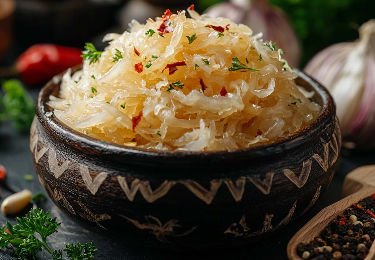 Квашеная капуста богата витамином С, пробиотиками и клетчаткой, а калорийность составляет всего 25 ккал на 100 г.