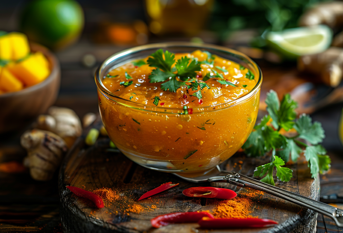 Аджика «Тропический взрыв» с манго и имбирем — это яркий микс остроты и сладости с экзотическим акцентом. Для этого необычного и вкусного соуса потребуется 400 г красного болгарского перца, 200 г острого перца халапеньо, 1 спелое манго, 50 г свежего имбиря, 3 зубчика чеснока, 1 ст. л. меда, 1 ч. л. куркумы, сок 1 лайма и 1 ч. л. соли.