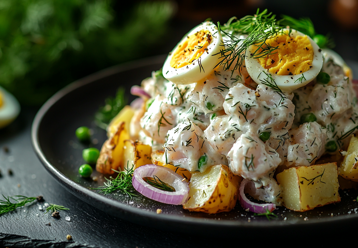 Отвариваем 300 граммов рыбного филе с лаврушкой — пусть напитается ароматом. Разбираем на нежные волокна, добавляем 200 граммов печеного картофеля, нарезанного кубиками, 100 граммов соленых огурчиков и 50 граммов красного лука, нашинкованного полукольцами для пикантной остроты.