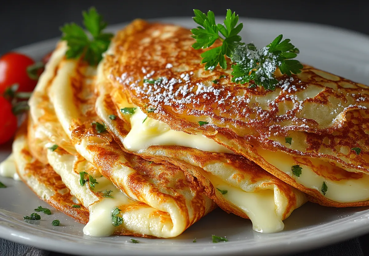 Блинчатые пирожки с сыром — находка для любителей тянущихся начинок. Подавайте горячими с томатным соусом и наслаждайтесь!