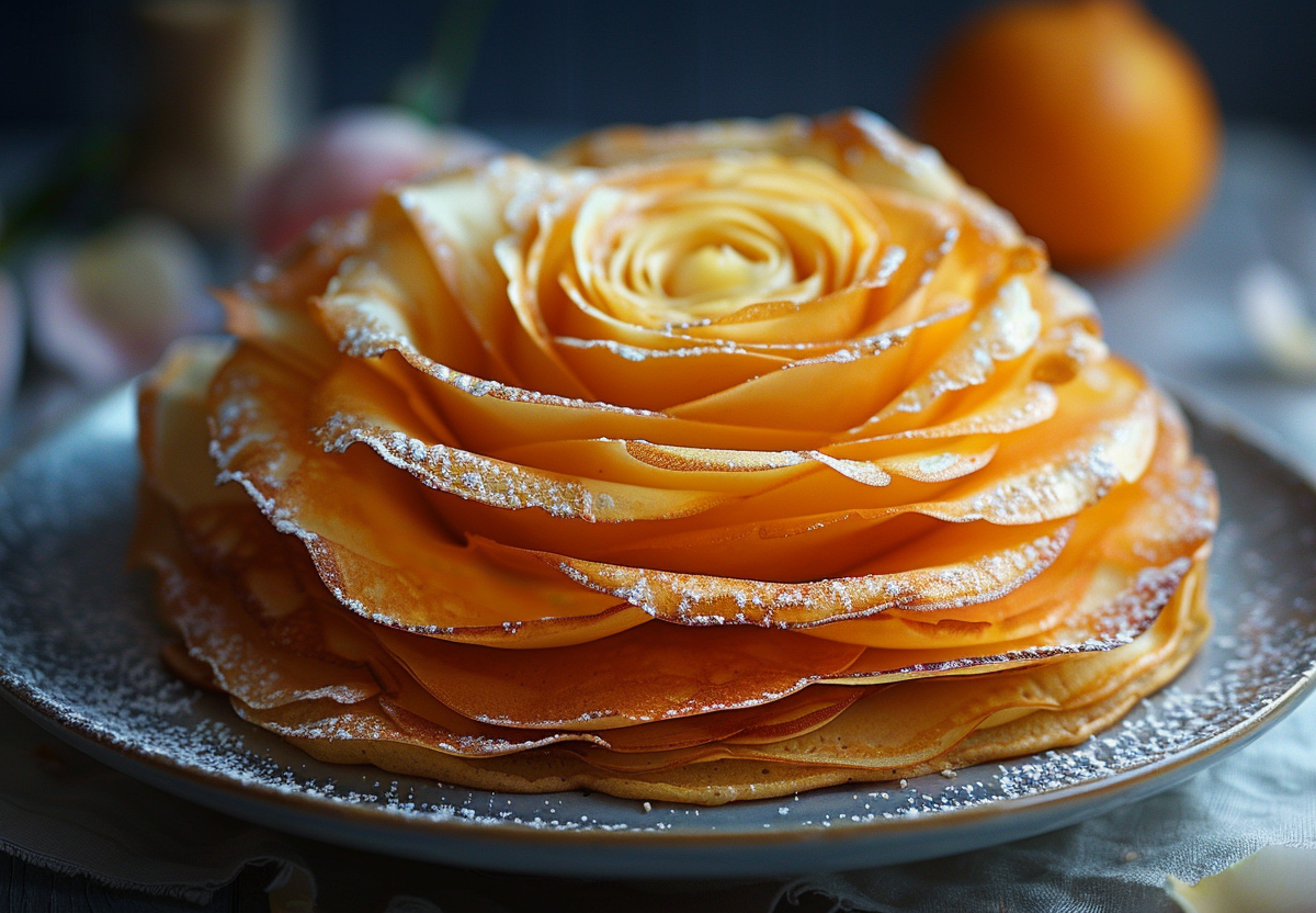 Возьмите плоское блюдо и положите на него 1 блин, смажьте его тонким слоем крема. Остальные блины разрежьте пополам. Каждую половинку смажьте кремом, сложите вдоль еще раз и сверните в неплотный рулетик. Ставьте эти «бутоны» вертикально на основу, двигаясь от центра к краям. Плотно прижимайте новые лепестки к предыдущим, формируя пышный цветок. Когда вся тарелка заполнится, аккуратно отогните края внешних блинчиков наружу, создавая эффект раскрывшегося бутона. Уберите конструкцию в холодильник на 3 часа для пропитки. Перед подачей украсьте основание торта 50 г свежей мяты.
