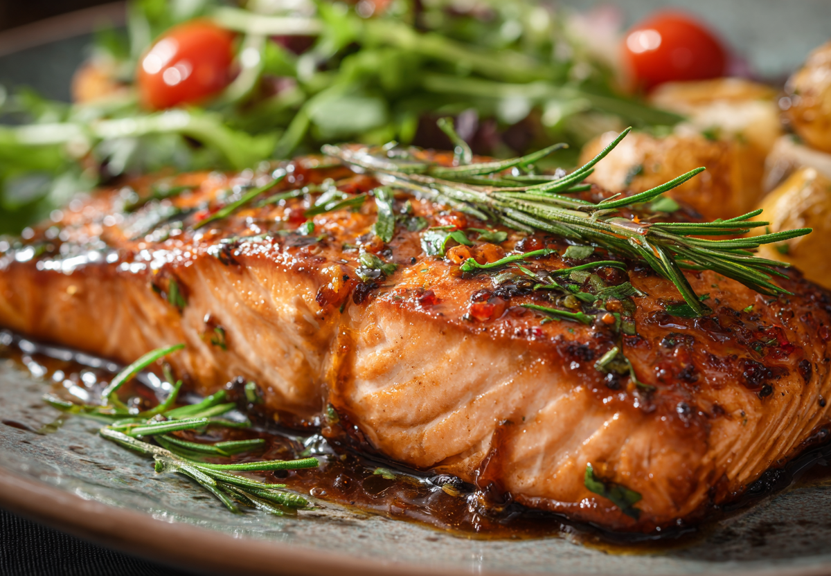 Разогрейте духовку до 200 °C. Противень застелите пергаментом и слегка смажьте маслом. Выложите филе кожей вниз. Щедро смажьте всю верхнюю поверхность и бока рыбы приготовленной глазурью, используя силиконовую кисточку или ложку. Не жалейте соуса — он и создаст ту самую эффектную карамельную корочку. Положите сверху на каждое филе по веточке розмарина.