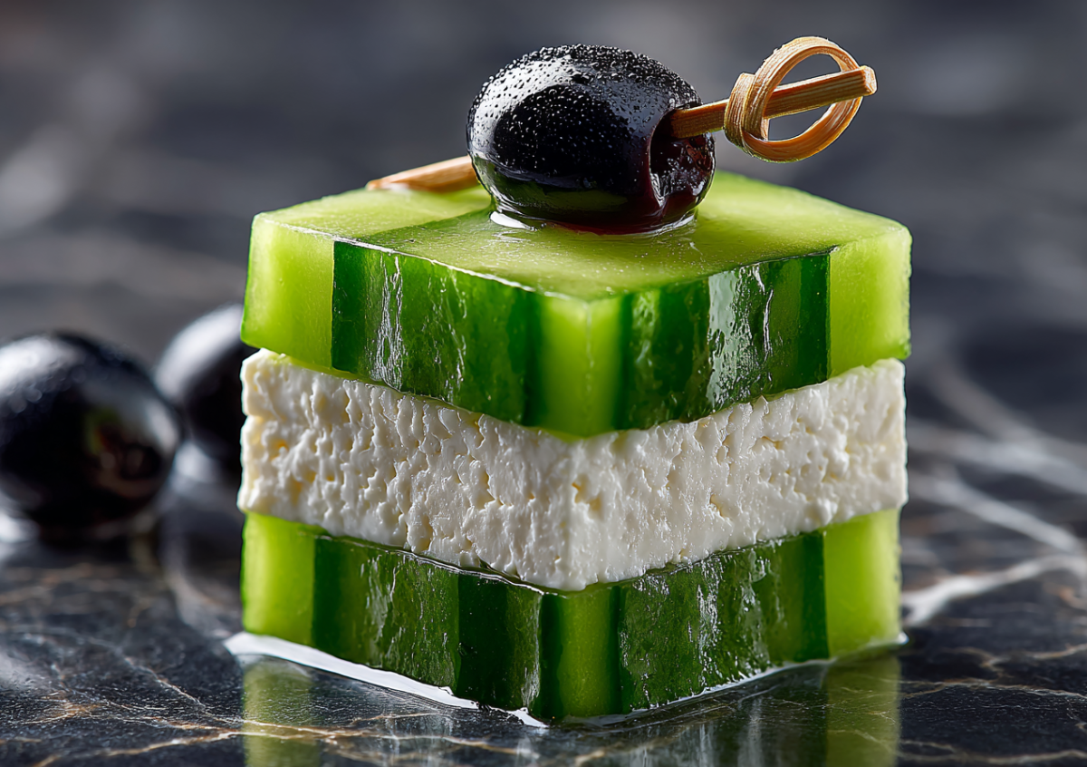 Эти канапе — идеальная легкая закуска для фуршета: свежий хрустящий огурец, солоноватая брынза и ароматные оливки создают гармоничное сочетание. Блюдо готовится быстро и смотрится ярко на праздничном столе.