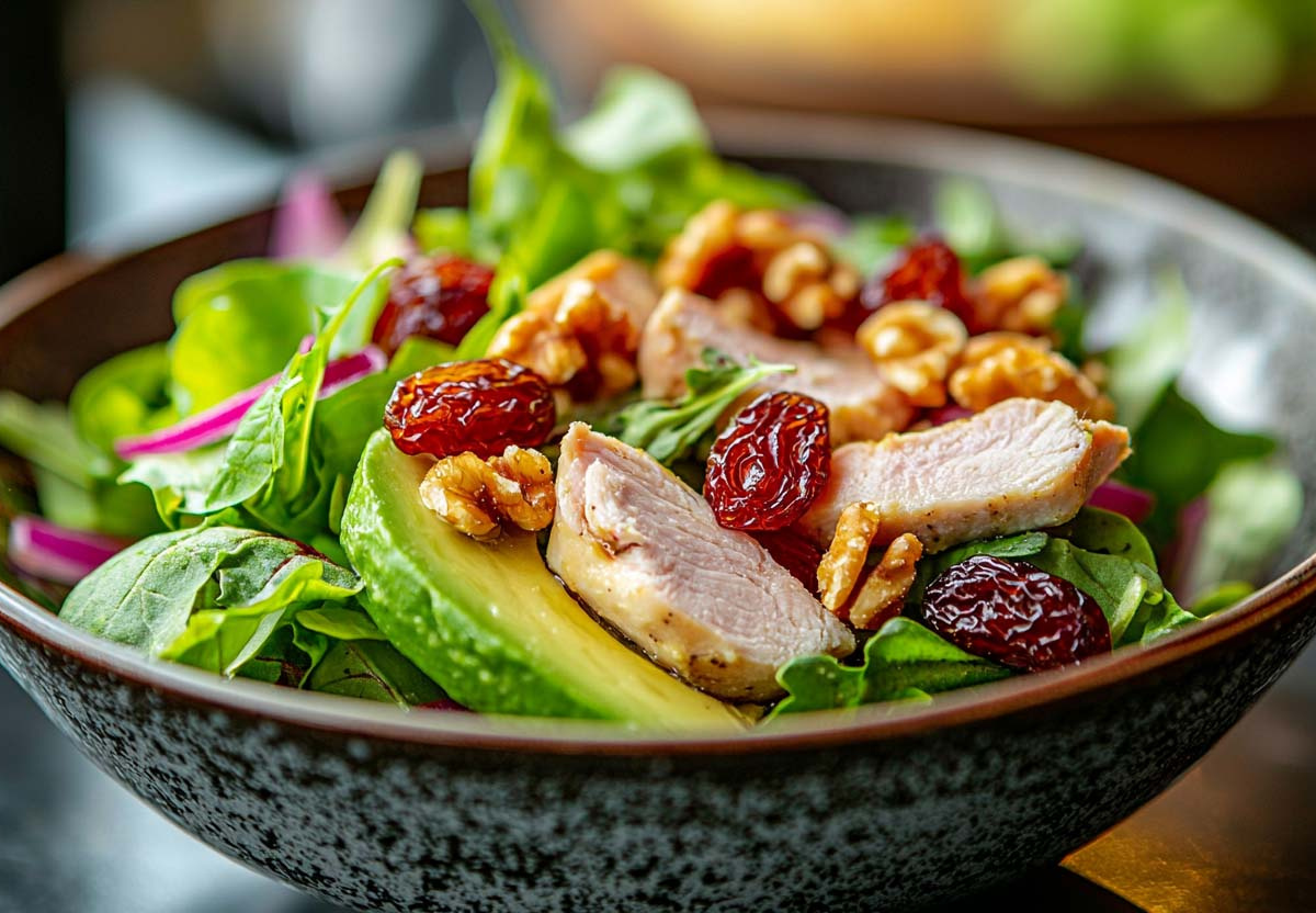 Для создания потребуется 5 ключевых компонентов: 200 г копченой курицы, один полностью спелый авокадо, половина красной луковицы, небольшая горсть изюма и 40 г дробленых грецких орехов. Заправкой послужит ароматная смесь из двух столовых ложек оливкового масла и столовой ложки зернистой дижонской горчицы. Копченую курицу нарежьте тонкими ломтиками. Мякоть авокадо аккуратно нарежьте крупными дольками. Красный лук нашинкуйте тонкими перьями и слегка помните руками, чтобы он отдал сок и стал нежнее. На сухой сковороде обжарьте грецкие орехи до появления насыщенного аромата. В салатнике соедините курицу, авокадо, лук, пухлый изюм и подрумяненные орехи. Отдельно взбейте оливковое масло с дижонской горчицей в однородный соус и полейте салат. Такой соус не только связывает ингредиенты, но и подчеркивает их индивидуальность, создавая удивительно гармоничное блюдо.