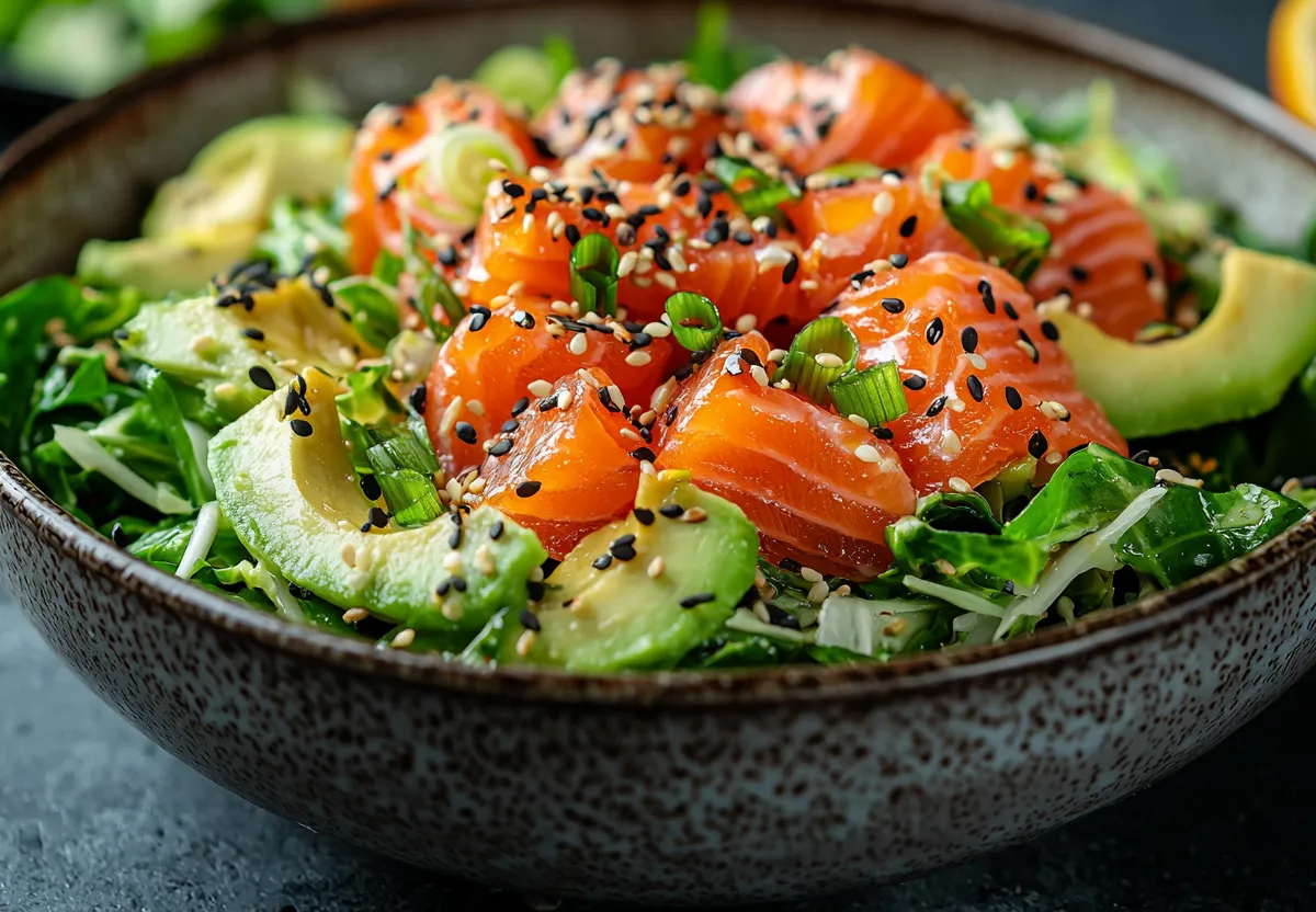 Начните с лосося. В сотейнике смешайте соевый соус, мед и содержимое пакетика зеленого чая. Доведите до легкого кипения, снимите с огня и полностью остудите. В холодный маринад погрузите стейк лосося и оставьте под крышкой в прохладном месте ровно на 5 часов. Этот способ не готовит, а томит рыбу, делая ее неправдоподобно нежной. Пекинскую капусту нашинкуйте тонкой соломкой, авокадо нарежьте кубиками, а водоросли залейте водой на 7 минут для набухания. Цитрусовый соус создается смешиванием свежевыжатого сока лайма, оливкового масла, шрирачи и чеснока, пропущенного через пресс. На сервировочное блюдо горкой выложите капусту, авокадо и отжатые водоросли. Аккуратно полейте соусом и перемешайте. Достаньте лосося из маринада, обсушите и нарежьте тонкими пластинами. Разложите рыбу поверх салата и щедро посыпьте все жареным кунжутом.