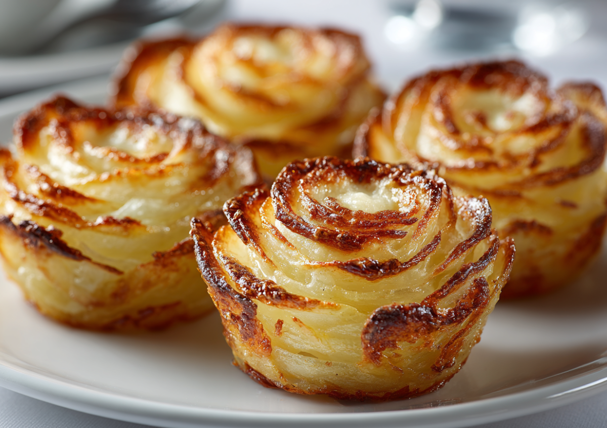 Нарежьте один крупный клубень картофеля тончайшими слайсами, как для чипсов. Слегка сбрызните их оливковым маслом и аккуратно посолите. В форму для маффинов выложите слайсы, формируя из них подобие розы с лепестками. Смешайте 100 г мягкого сливочного сыра, столовую ложку сметаны и чайную ложку трюфельного масла. Чайной ложкой заполните серединки картофельных «роз» сырной начинкой. Отправьте в разогретую до 200 °C духовку на 20–25 минут, пока края картофеля не подрумянятся и не станут хрустящими. Подавайте сразу, украсив веточкой укропа.