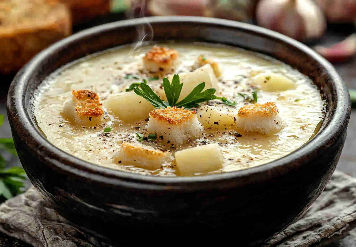 Ингредиенты: 1 литр воды или бульона, 3 средних картофелины, 7–10 зубчиков чеснока, 30 г сливочного масла, 1 ч. ложка молотого тмина, 1 лавровый лист, соль, перец по вкусу, 3 ломтика хлеба для гренок, 100 г твердого сыра (по желанию). Обжарьте чеснок и тмин на сливочном масле до ароматного состояния, не давая чесноку сгореть. Влейте воду или бульон, добавьте нарезанный картофель и лавровый лист, варите до мягкости картофеля. Приправьте солью и перцем. Хлеб нарежьте кубиками и обжарьте до хруста. Подавайте суп горячим с гренками и посыпьте тертым сыром.