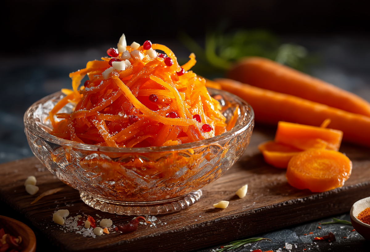 Морковь (500 грамм) натрите на специальной терке соломкой — это основа будущего хруста. К ней отправьте давленый чеснок (3 зубчика) и тонко нарезанную курагу (50 грамм), которая отвечает за сладкие ноты. Теперь к заправке моркови по-корейски: в разогретое до легкого дымка масло киньте столовую ложку паприки — она тут же раскроет цвет и аромат. Этим маслом залейте смесь сахара (1 ч. л.), соли (1/2 ч. л.), уксуса (1 ч. л.), 9%) и перца черного молотого по вкусу, сделав маринад. Тщательно обваляйте морковную соломку в этом ароматном соусе, чтобы пропиталась вся масса.