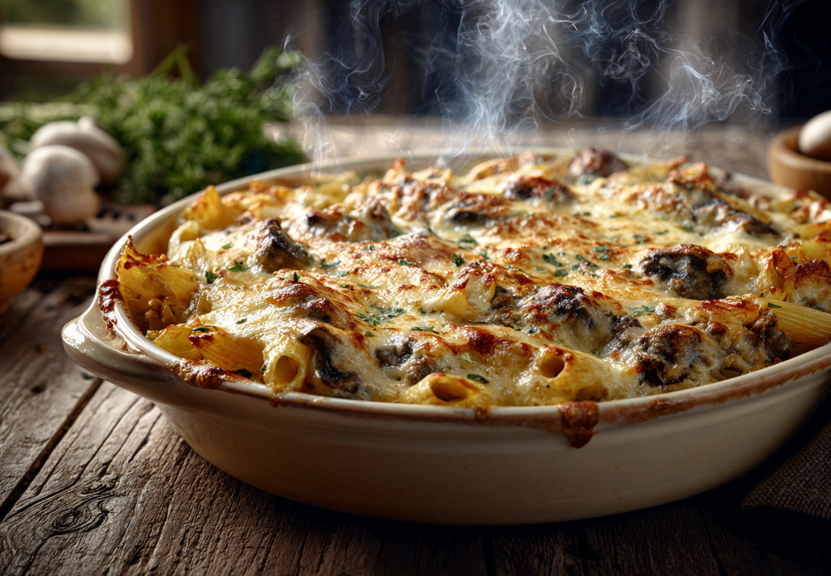 Готовую запеканку извлекают из духовки, дают постоять 5–7 минут перед подачей. Сочетание фарша с грибами в сливочном соусе делает блюдо особенно сытным и ароматным. Такие макароны в духовке не требуют дополнительных соусов и служат полноценным обедом или ужином.