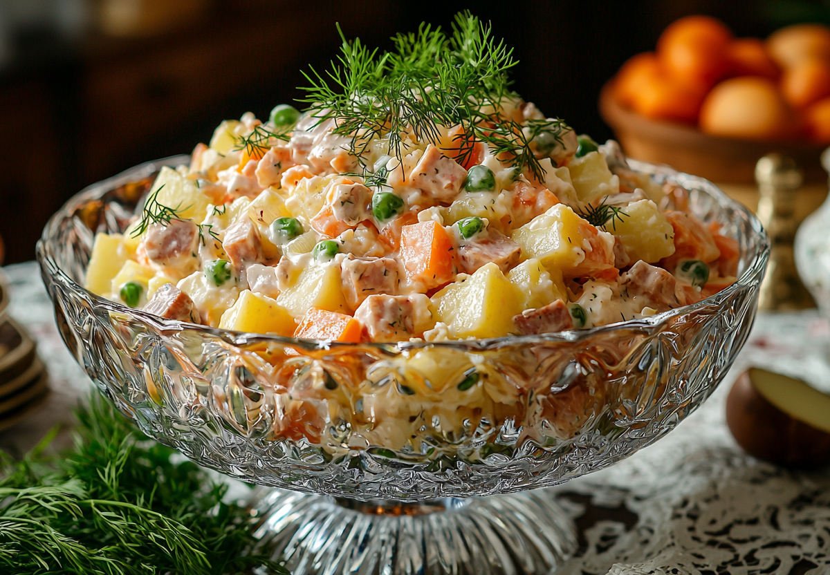 Этот вариант оливье выбирают, когда хочется более выразительного, яркого вкуса. Продукты простые, сочетание классическое, а результат получается идеальным: салат выходит сочным, плотным и с правильным балансом вкуса.