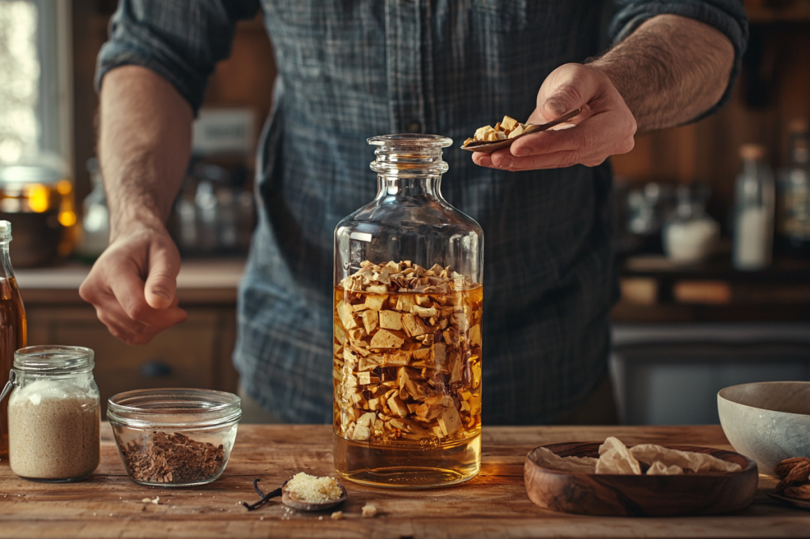 Для базы возьмите качественный самогон двойной перегонки крепостью 45–50 градусов. На литр напитка понадобится 2 столовые ложки дубовой щепы средней обжарки, чайная ложка сахарного сиропа и щепотка ванилина. Щепу предварительно залейте кипятком на 10 минут, затем просушите. Смешайте все компоненты в стеклянной емкости, плотно закройте и оставьте в темном месте при комнатной температуре на 3–5 дней. Ежедневно встряхивайте содержимое.