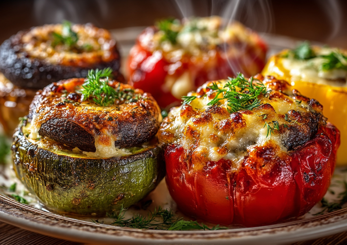 На этот раз предлагаем немного усложнить задачу и сделать блюдо более фактурным. Возьмите 2 крупных помидора, 1 болгарский перец и 2 небольших молодых кабачка. Срежьте у них верхушки и аккуратно удалите сердцевину, чтобы получились «чашечки» для начинки. Для начинки смешайте 150 г отварного булгура с 1 обжаренной луковицей, измельченной мякотью овощей (которую вы достали), 100 г шампиньонов и 2 зубчиками чеснока. Заполните этой ароматной смесью овощные заготовки, посыпьте сверху 50 г тертого сыра и запекайте в духовке при 180 градусах 25–30 минут.