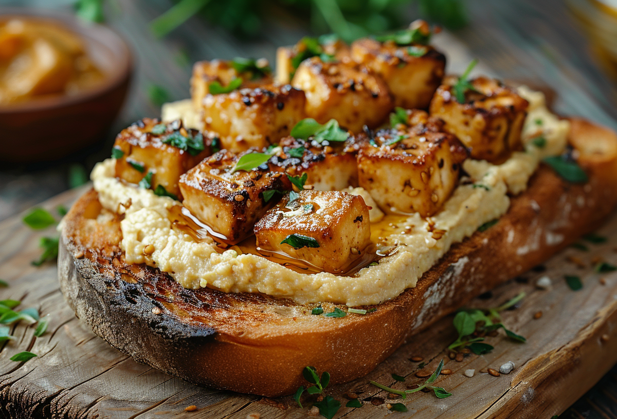 Нарежьте тофу брусочками. Обжарьте его на сухой сковороде с добавлением соевого соуса — он придаст пикантность. Вместо масла используем хумус: намажьте его толстым слоем на подсушенный в тостере хлеб. Сверху выложите горячий тофу и посыпьте прованскими травами.