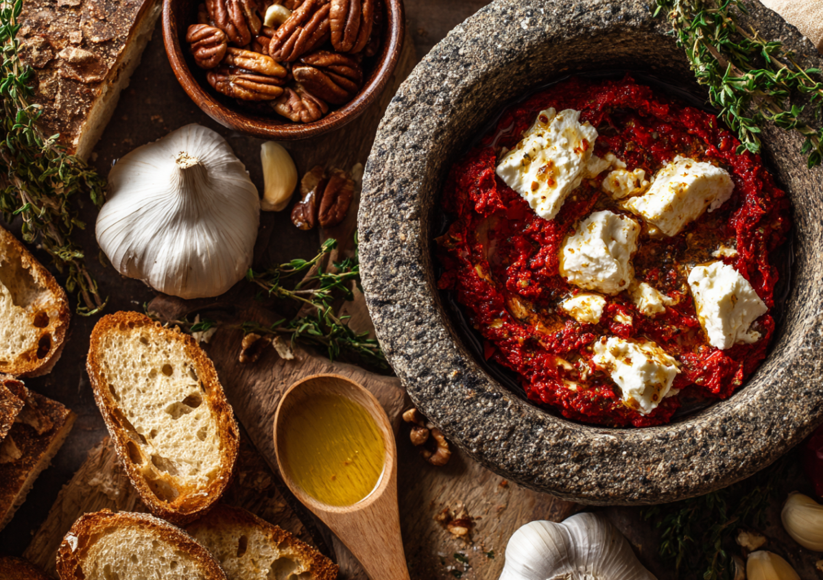 Два крупных сладких красных перца запеките в духовке до мягкости и подрумяненной кожицы. Горячими поместите в пакет, затем очистите от кожицы и семян. Мякоть измельчите ножом в неоднородную массу. В ступке растолките зубчик чеснока с щепоткой крупной соли и листочками свежего тимьяна. Соедините перечную массу, чесночно-тимьянную пасту и 100 граммов мягкого козьего сыра. Тщательно, но аккуратно перемешайте до состояния густого крема с кусочками. Влейте столовую ложку оливкового масла холодного отжима для бархатистости. Паста обладает сладковатым дымным вкусом, прекрасно сочетается с хрустящей брускеттой или зерновым хлебцем, украшенной орешком пекан.