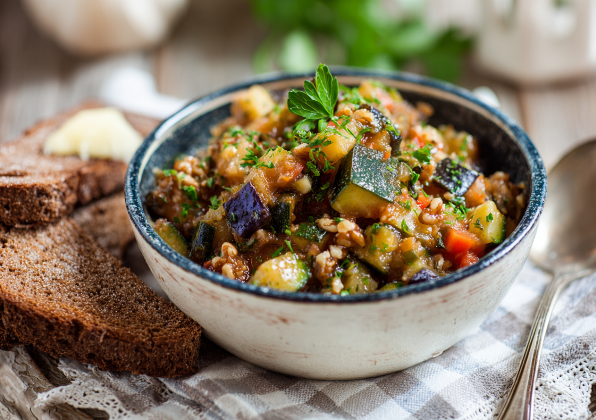 Кабачковая икра «Как из детства» с баклажанами и ореховой крошкой — любимый вкус из прошлого, который переносит в теплые кухонные воспоминания. Чтобы воссоздать это блюдо, подготовьте: килограмм свежих кабачков, пару спелых баклажанов, три мясистых болгарских перца, две сочные морковки, две головки репчатого лука, четыре ароматных зубчика чеснока, столовую ложку концентрированной томатной пасты, полстакана измельченных ядер грецкого ореха, чайную ложку молотого кориандра, половину ложки хмели-сунели, столовую ложку виноградного уксуса, а также соль, молотый перец, свежую зелень петрушки или кинзы и масло для пассеровки.