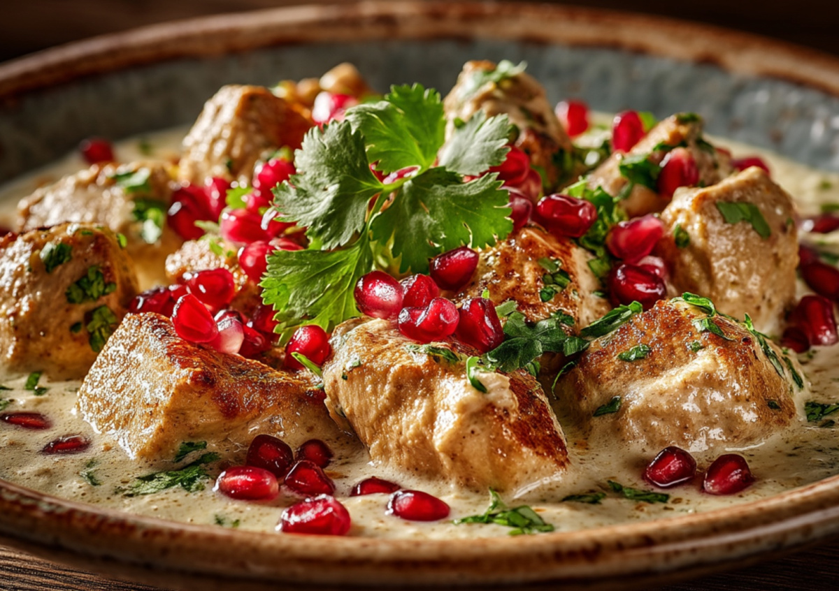В самом конце приправляем соус солью, любимыми специями и вливаем белый винный уксус. Последний раз тщательно перемешиваем и выключаем огонь. Соус готов. Остывшую курицу разделываем, отделяя мясо от костей. Заливаем кусочки курицы теплым соусом, перемешиваем и даем блюду полностью остыть. Перед подачей украсьте сациви свежей кинзой и зернами граната. Приятного аппетита!