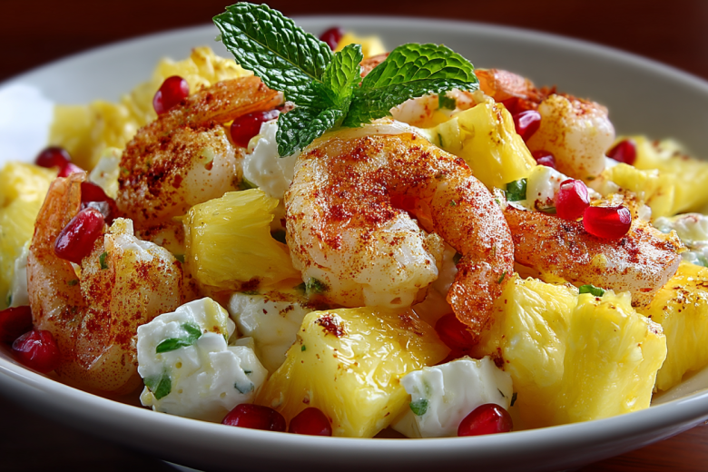 Ингредиенты: креветки очищенные — 300 г, яйца — 3 шт, ананасы консервированные — 200 г, сыр твердый — 150 г, йогурт натуральный — 100 г, горчица дижонская — 1 ч. ложка, чеснок сухой — 0,5 ч. ложки, соль, перец — по вкусу.