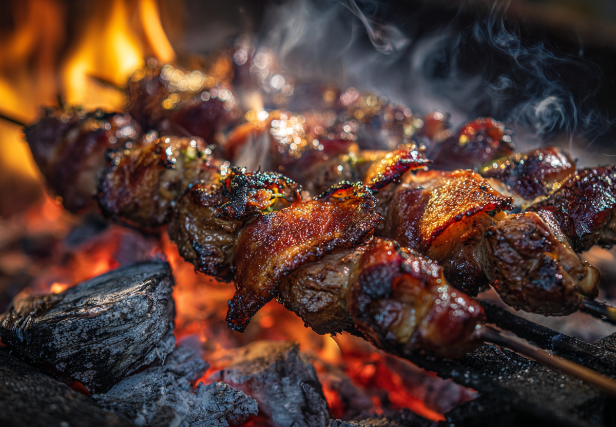 Каждый кусочек печени завернуть в полоску бекона — плотно, внахлест, как конвертик. Нанизать на предварительно замоченные в воде деревянные шпажки по 3–4 рулетика. Жарить над прогоревшими углями 10–12 минут, дважды перевернув, до хрустящей корочки бекона. Готовность проверить, разломив один кусочек: печень внутри должна быть сочной и чуть розоватой — без крови.