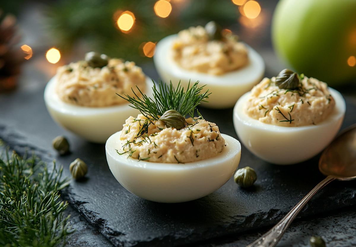 Фаршированные яйца с печенью трески — отличный выбор для праздничного стола, особенно если хотите внести северный акцент в классическое новогоднее меню. Этот простой рецепт по силам начинающим кулинарам, а закуска получается очень вкусной, сочетая нежность текстуры и яркую яблочную кислинку.