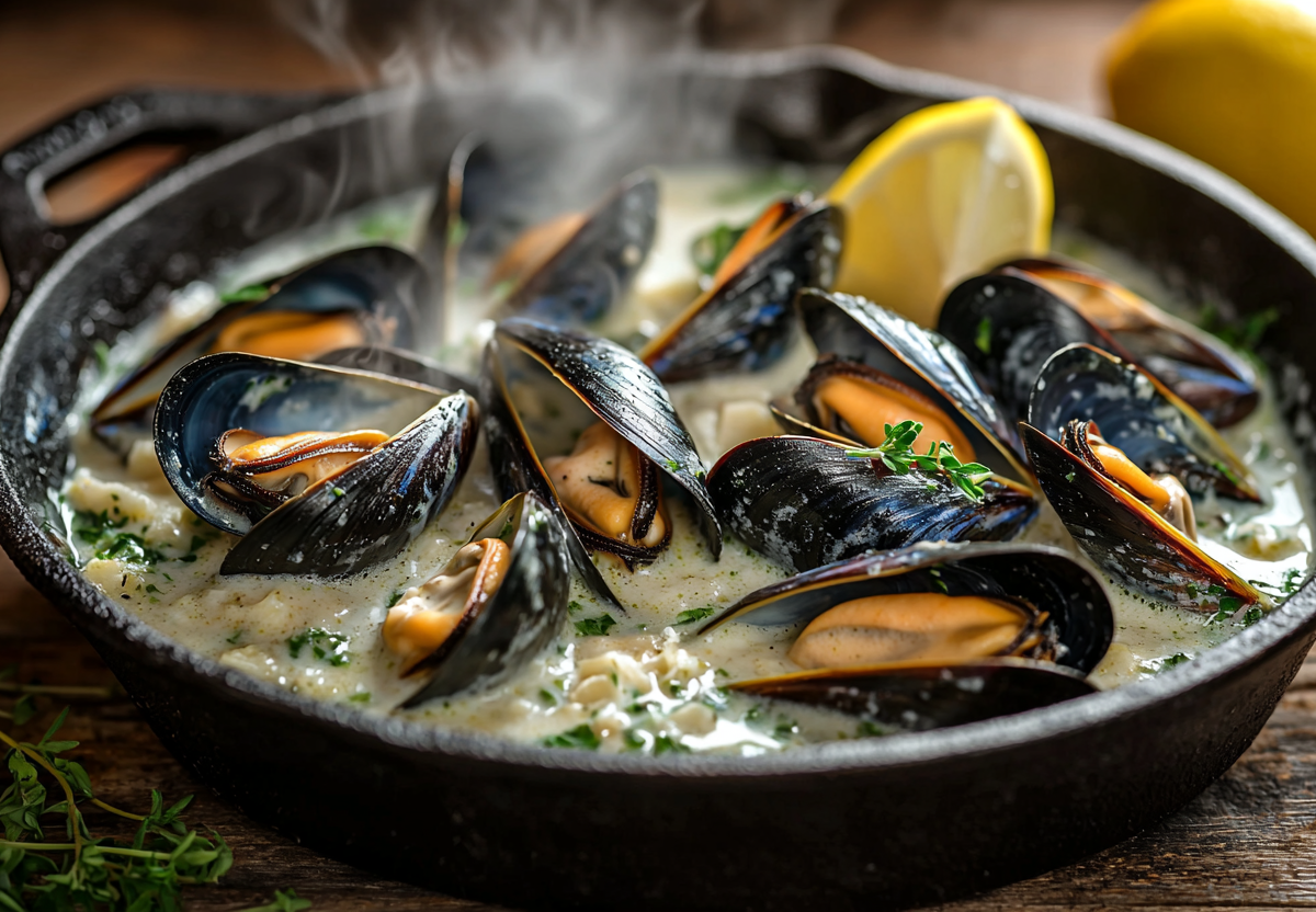 Мидии в белом вине — тот редкий случай, когда домашний ужин выглядит как подача в хорошем бистро. Нежное мясо моллюсков пропитывается паром из вина, чеснока и масла, и в тарелке оказывается легкое, ароматное блюдо с характером. Такие блюда с алкоголем радуют тем, что вкус яркий, но без тяжести.