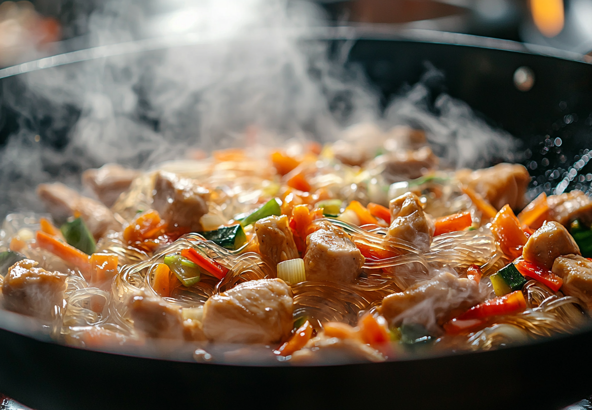 Необязательно ехать в Азию, чтобы приготовить что-то необычное — к фунчозе достаточно добавить те ингредиенты, что найдутся в холодильнике любого россиянина. Этот вариант лапши идеально подойдет тем, кто любит сытные и понятные блюда: курица, овощи и немного соевого соуса создают яркий вкус, а ложка сметаны добавляет уютную русскую ноту.