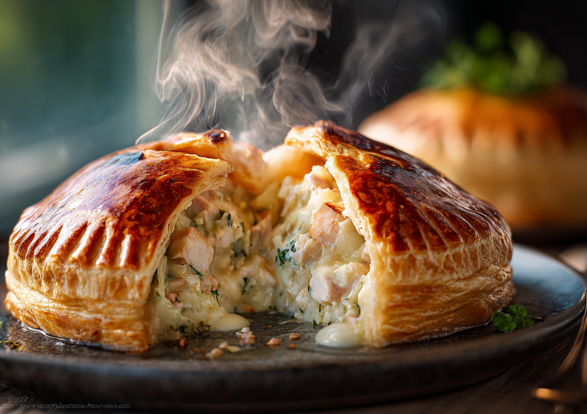 Это блюдо выглядит невероятно празднично благодаря эффектному куполу из теста, а начинка из рыбы, сливок и имбиря обладает изысканным, согревающим вкусом.